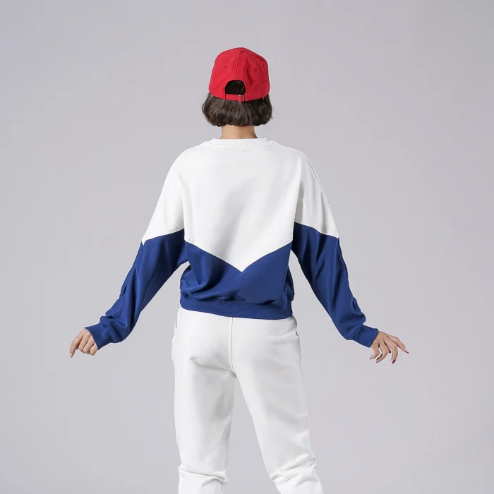 Two-coloured sweatshirt with red embroidery detail on the front. The model wears a size S.
