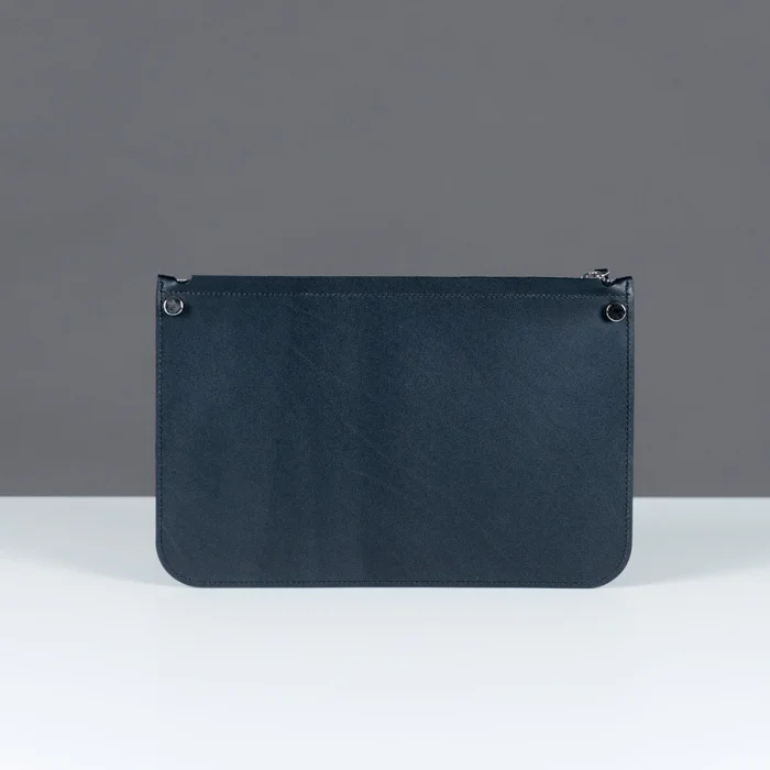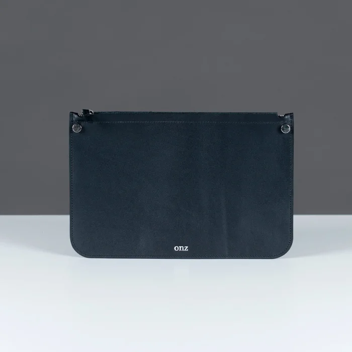 Vegetable tanned black calf leather medium pouch with two silver 1.5cm barbells, the onz silver logo and raw interior.