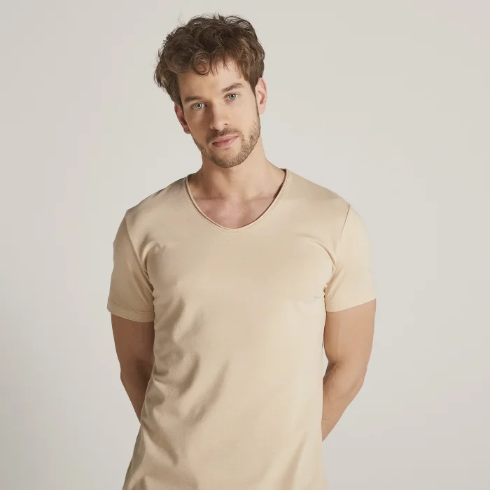 Men's Sausage Collar Basic T-Shirt made of organic cotton. It provides you comfort and flexibility all day long with its cotton texture and lycra fabric. Thanks to its breathable fabric, your skin stays more comfortable and dry. The instructions are printed on the product, not an annoying label. Our brand logo is embroidered on the sleeve of the product with a quality embroidery. Material:95% organic cotton, 5% elastane (lycra) for elasticity. GOTS certified organic cotton is used in our products. Model's measurements: Height: 184 Bust: 100 Waist: 74 Hips: 97 Size above the model: M By purchasing products produced with organic cotton, you can contribute to nature and the future.