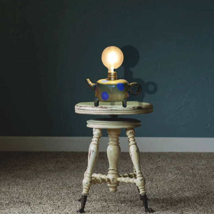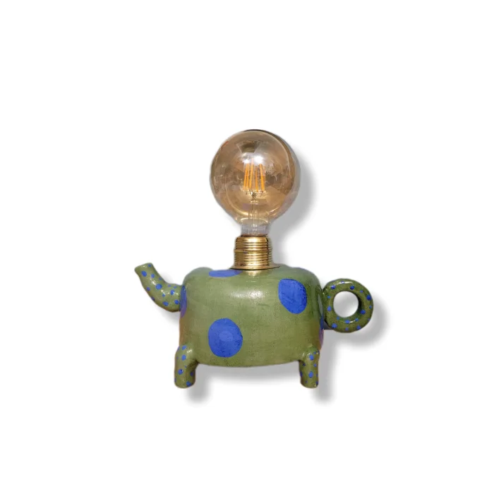 Teapot-shaped, blue pointed on green coloured, handbuild , hand-painted, ceramic table, bedside lamp, decorative lighting object.