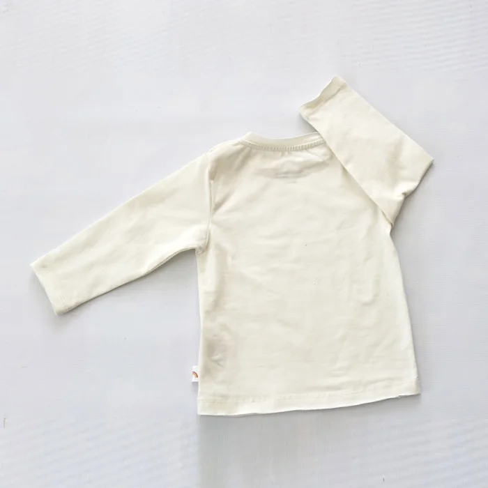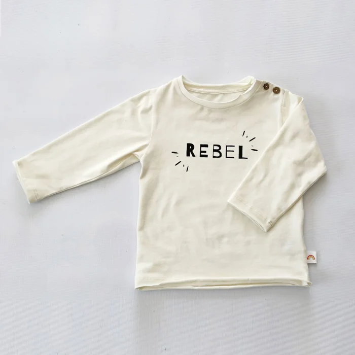 The buttons are produced from coconut shell. Slogan press words by organic paint. Printed brand and size label on the neck so that it would not irritate your children’s skin.