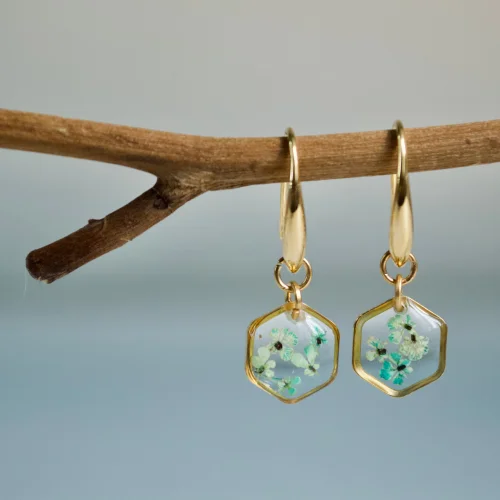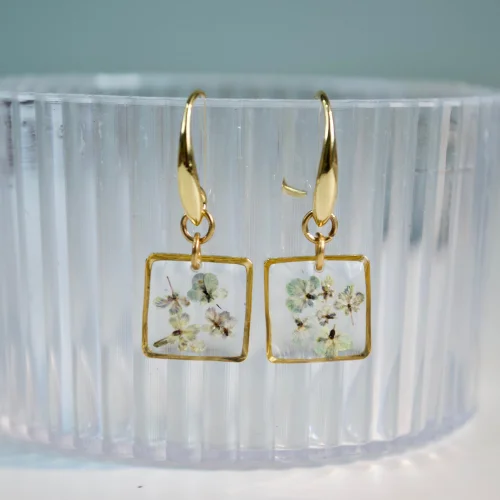 The wild flowers named Queen Anne's Lace are collected from our farm and dried by pressing method and colored with vegetable dyes. Then these flowers are combined with jewelry-grade resin in a gold-plated over bronze in minimal sizes. Finally, it is combined with other parts and tiny gardens that carry nature in them are formed! The brand's motto is “Tiny garden on your body! we define it as". Each product in Fiorel's collections is a rare piece, each piece becomes a special accessory for its owner, as it consists of flowers that are unique in nature.