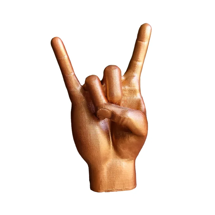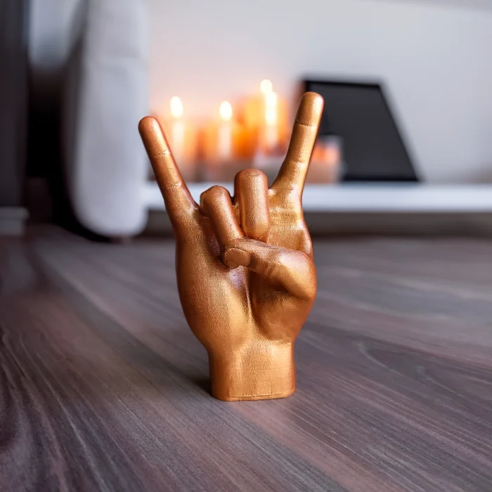 Height: 20 cm, Width: 12 cm, Depth: 7 cm Sustainable and environmentally friendly production with biopolymer material Rock sign design that draws attention with its gold color A perfect gift option for lovers of music and rock culture Ideal for those looking for modern and original home décor