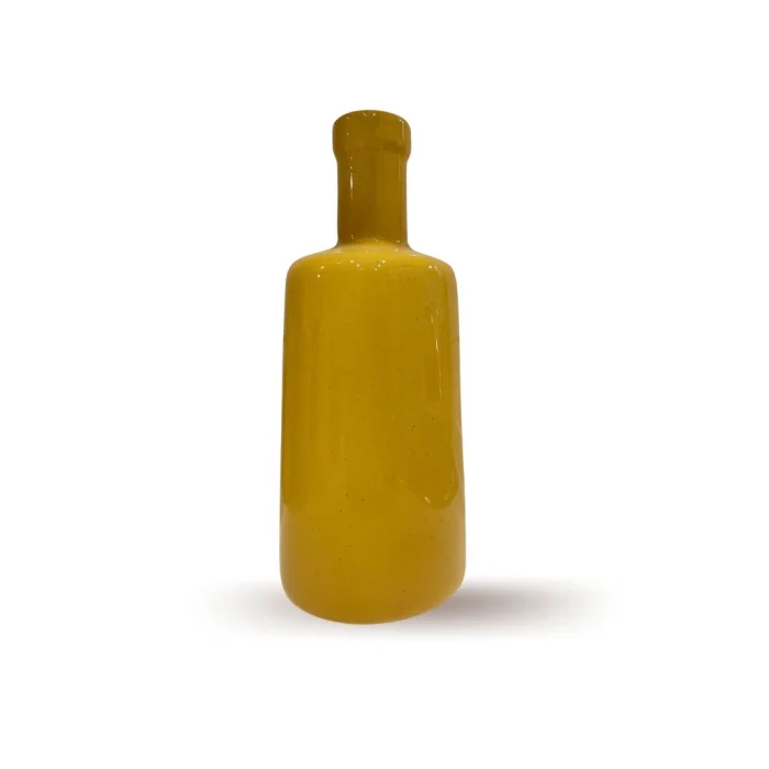 Extra virgin olive oil in a yellow uranus model handmade special 100% natural ceramic bottle. It is produced from table black and green olives collected from Gemlik district and villages. Up to 0.3% in Oleic Acid. It should be protected from daylight. Extra Virgin Olive Oil can freeze below +5°C. The dissolution of olive oil does not affect its quality.