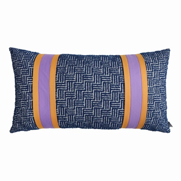 Decorative pillow with rectangular, pink and denim welts, blue texture in the middle.