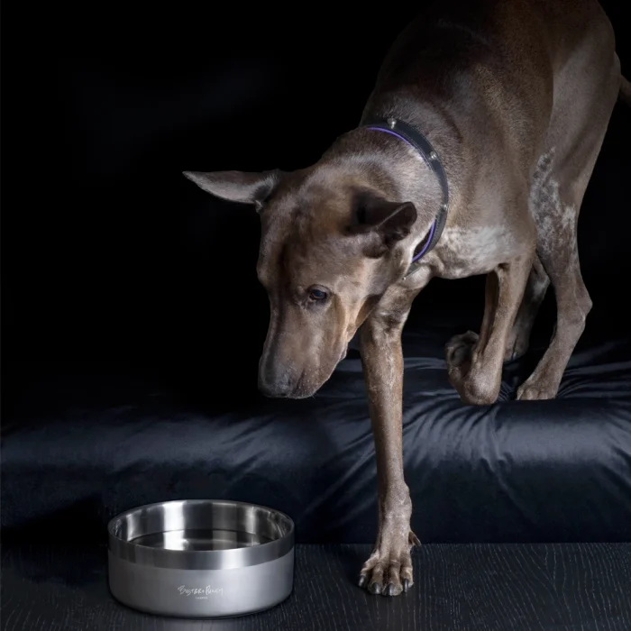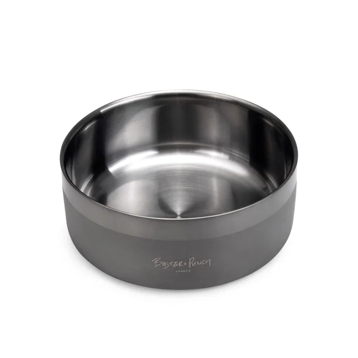 Buster + Punch Dog Food Bowl Stainless Steel. A dog food bowl made of pressed stainless steel, in pistol metal, with a brushed and sandblasted surface, and featuring an elegant, embossed B+P logo. The silicone bumper underneath prevents slipping. Our DOG bowl comes in gift wrapper, which makes it perfect for all dog lovers to take out of the box.