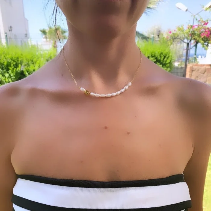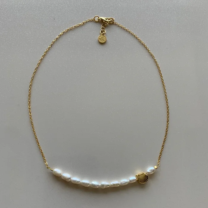 Gold chain is a premium coating, it does not tarnish. Natural pearls are used. The gold mussel detail is a premium coating that does not tarnish. It is a very elegant necklace that you can use for many years, with its pearl detail in sports elegance and stylish invitations.