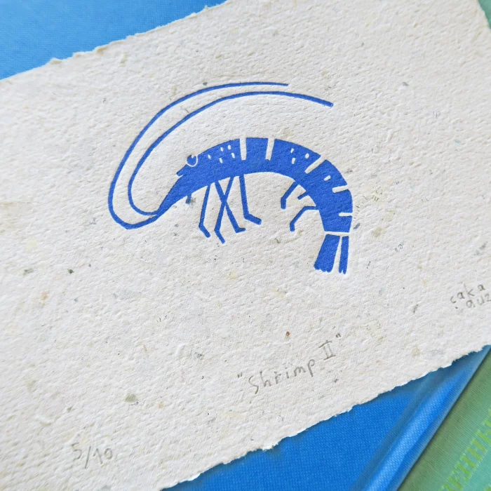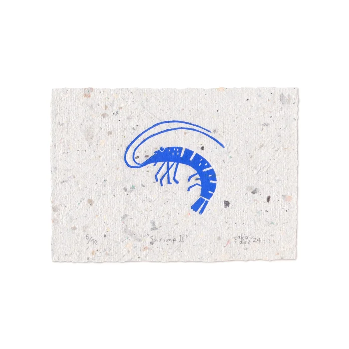 “Shrimp II” * Hand drawn, hand carved and hand printed. * Printed on recycled handmade paper. * This is a limited edition of 10 prints. * Prints are signed and numbered. * Since this is a handmade piece, some small variations may occur from print to print. * Approximate size of the paper: 15 x 21 cm.
