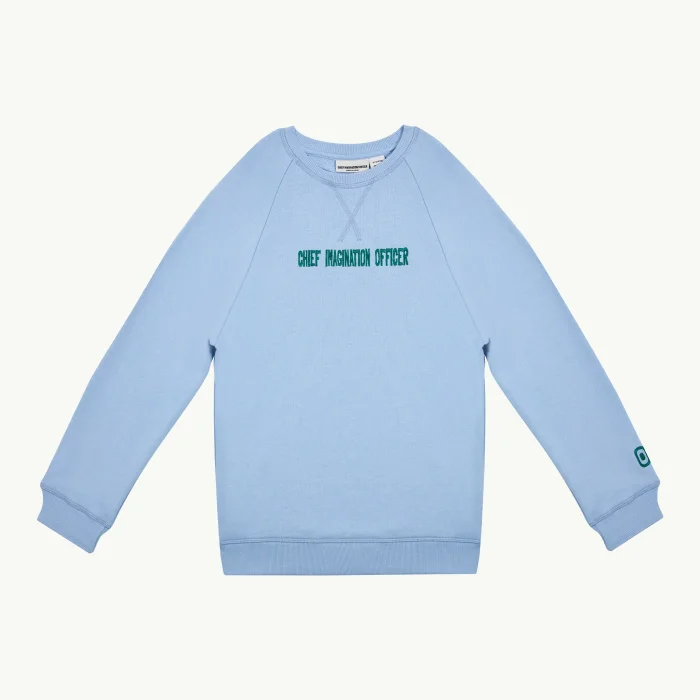 Our signature Kids Sweatshirt, Designed with a comfortable relaxed fit and Raglan sleeves, it showcases the 'Chief Imagination Officer' embroidery at the chest and our iconic brand emblem on the sleeve. Crafted from 100% GOTS certified Organic Cotton, its very soft and gentle on the skin