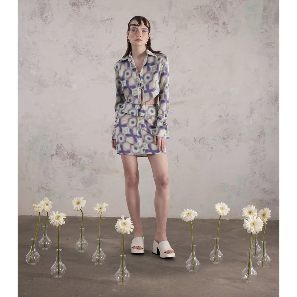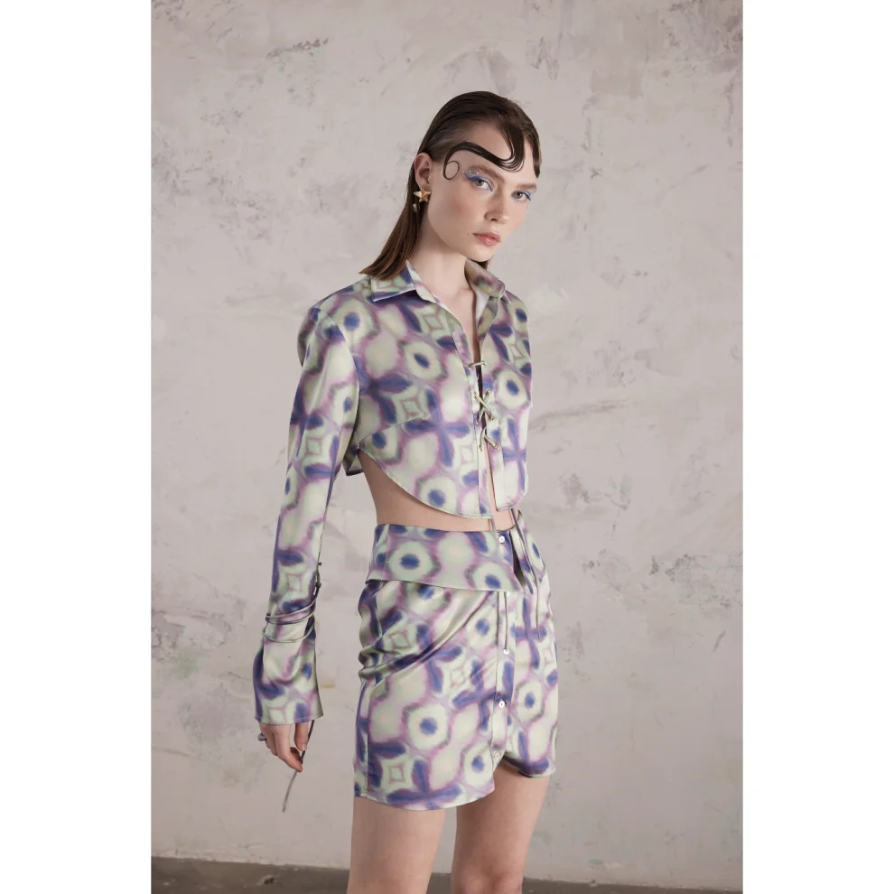 Short, flounced sleeve shirt with front closure and sleeve ties