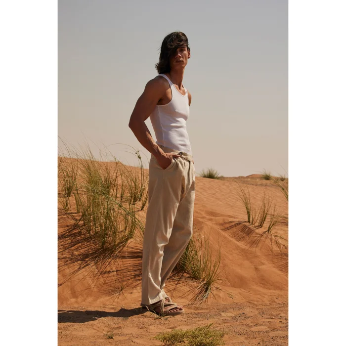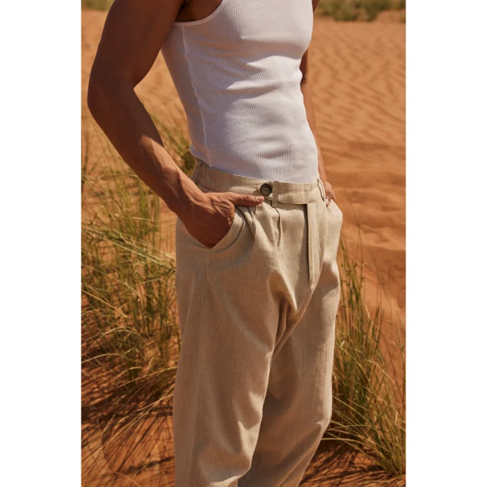 Kimono:-Oversized ,-%100 linen fabric, -Belted, tied from the front, -Wrap front, -Pleated front and back, -Shoulder epaulettes \\Pant:-Pleated front, 100% linen fabric, -Wide leg, -High waisted, -Hook and button closure with a concealed zip and a tab, -Two side pockets,-A welt pocket at the back