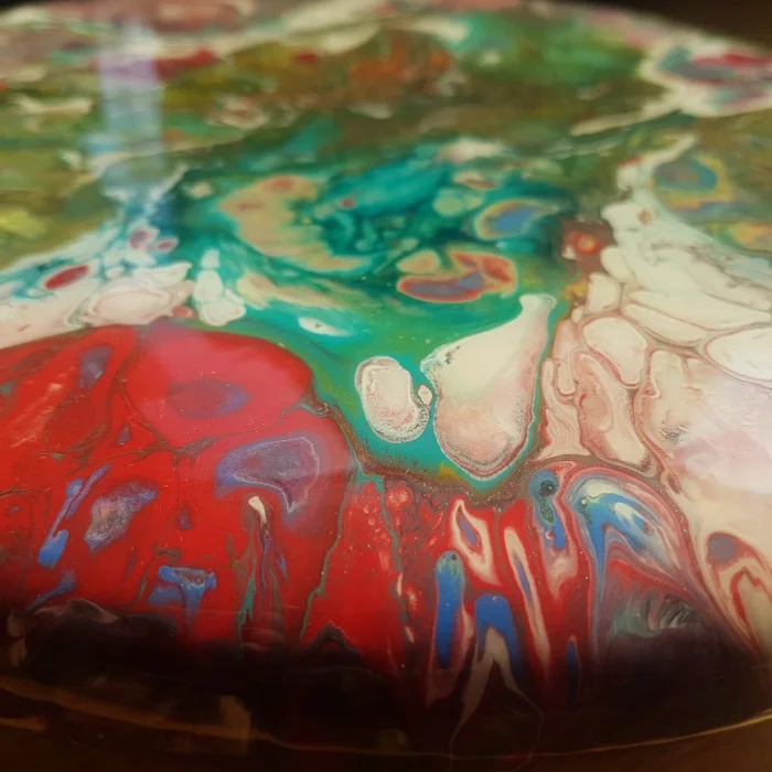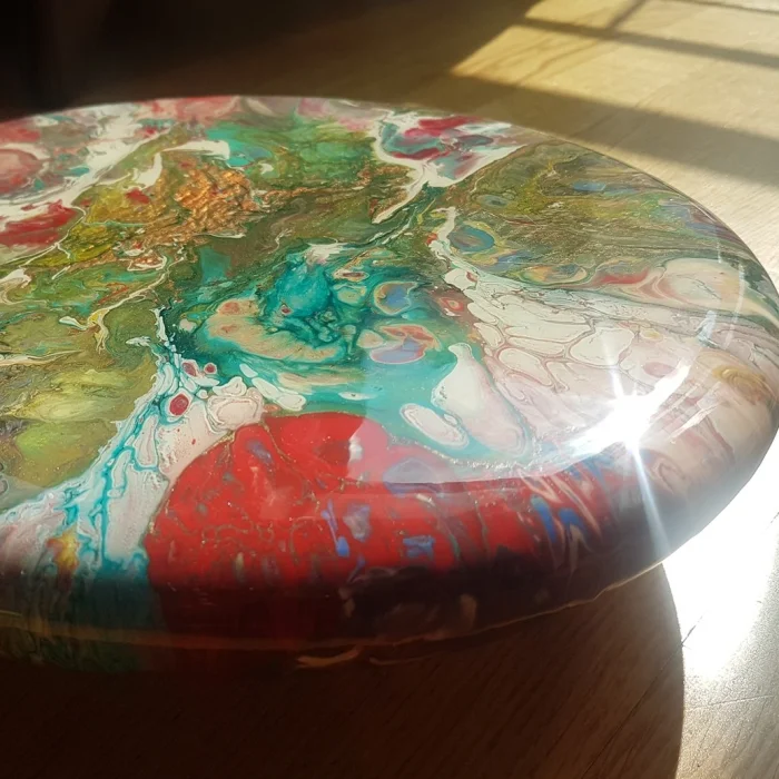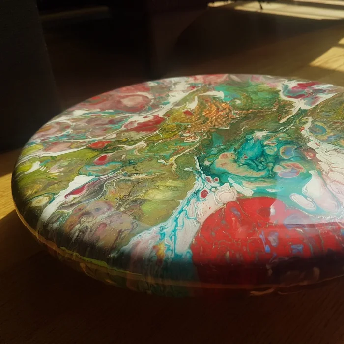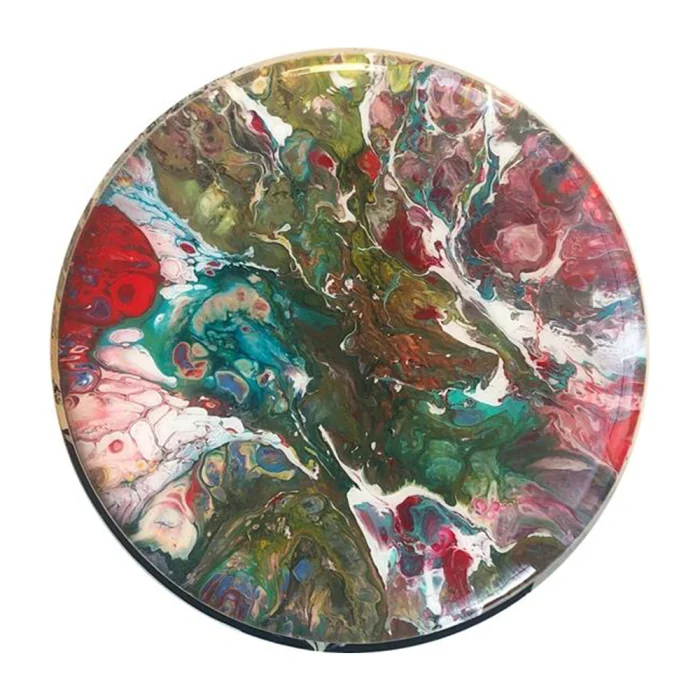 Signed single product. It was hand-made with acrylic paint using pouring technique on linden wood, and epoxy suitable for health was applied. It can be used as a home accessory, a serving plate, or it can be used as a table by removing the legs. The product has a diameter of 30 cm and a thickness of 30 mm. It has 3 wooden legs with a height of 40 mm. Its total height is 70 mm and its approximate weight is 600 grams.