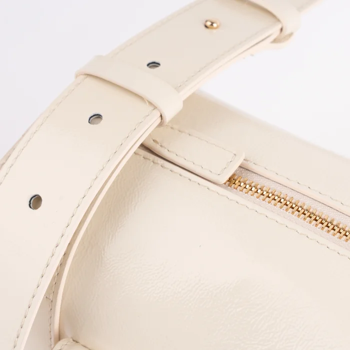 Square prism bag in beige shiny calf leather with zipper closure and adjustable shoulder strap. One side pocket with magnetic closure and internal pocket with zip. Beige stitching and gold logo at front. Internal red lining.