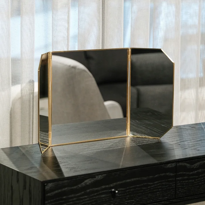 When opened 60cm x 30cm When closed 30x30cm The product is produced by applying a special handwork to a 3mm flat mirror. Original metal brass is used. It is not a coating.