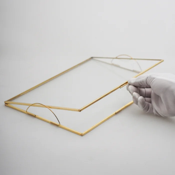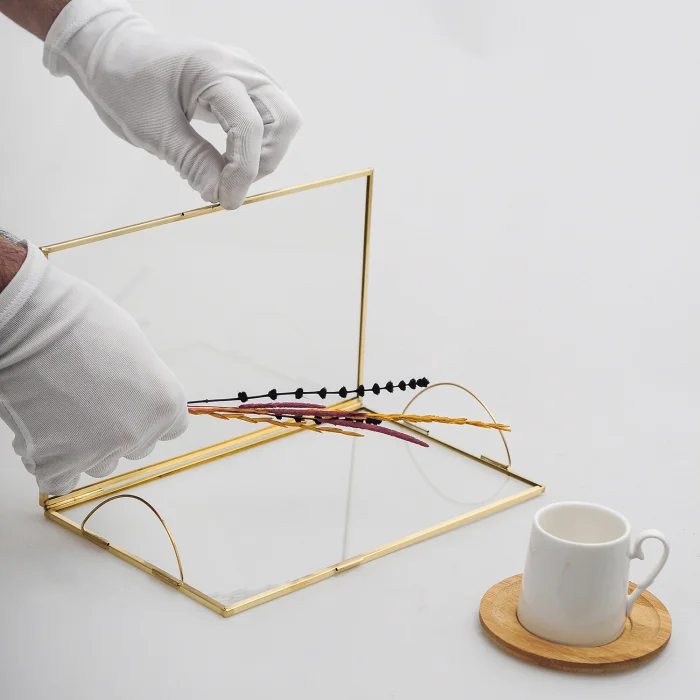 1 Piece 25x15cm Covered Engagement Tray The tray consists of two layers. Thanks to its lid, you can personalize the tray with dried flowers or photos between layers. Raw rice is used. It is not a coating. The product is produced by handcrafting 3mm flat glass and raw brass.