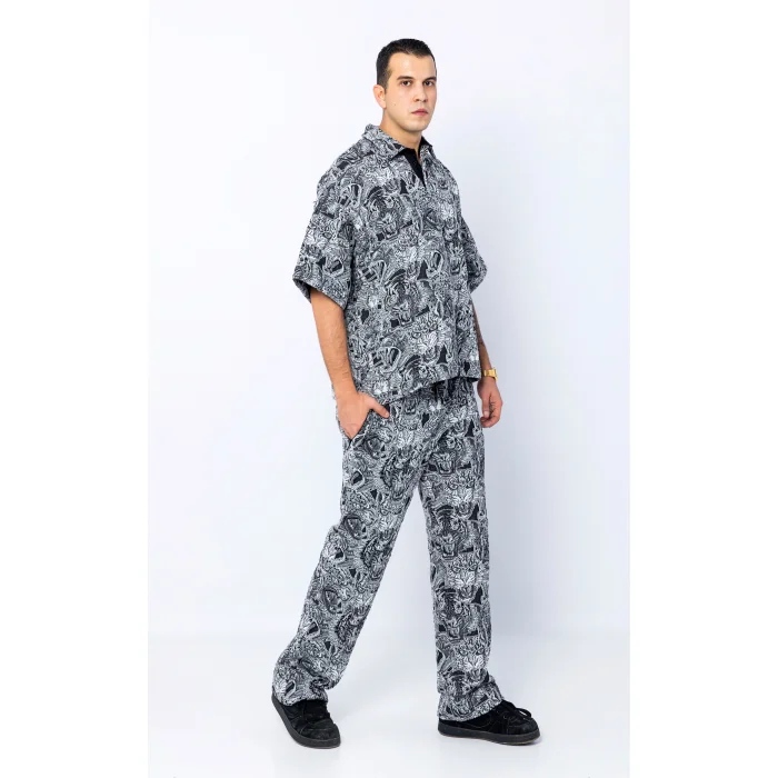 It is jacquard and loose-fitting. It has a wild theme pattern with gray-black-and-white details.