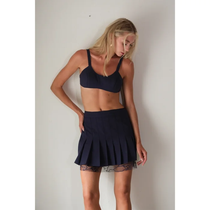 Low mini skirt. Skirt with navy blue pleated design and lace details.
