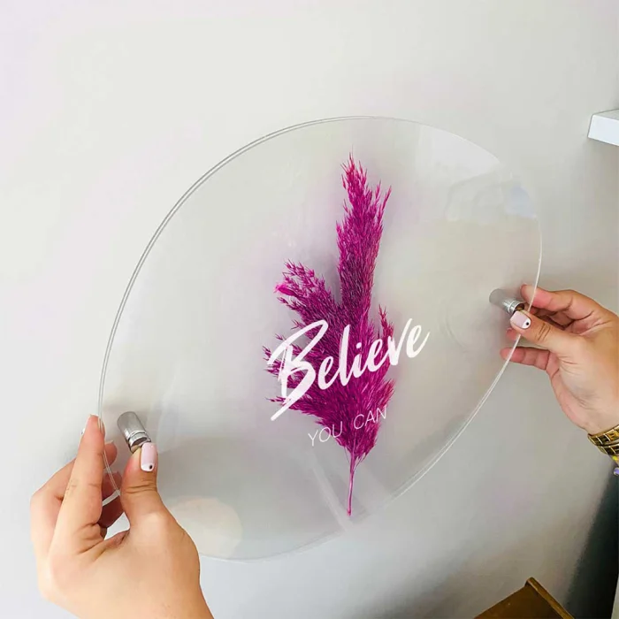 The product consists of 6 pieces in total, including 2clear acrylic sheets and 2 sign hanging screw sets, 1 dried flower and 1 label.