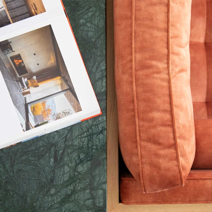 Solid American Oak. Tone variations and checking in wood as it expands and contracts is natural and expected. Table top; Verde Guetemala Marble