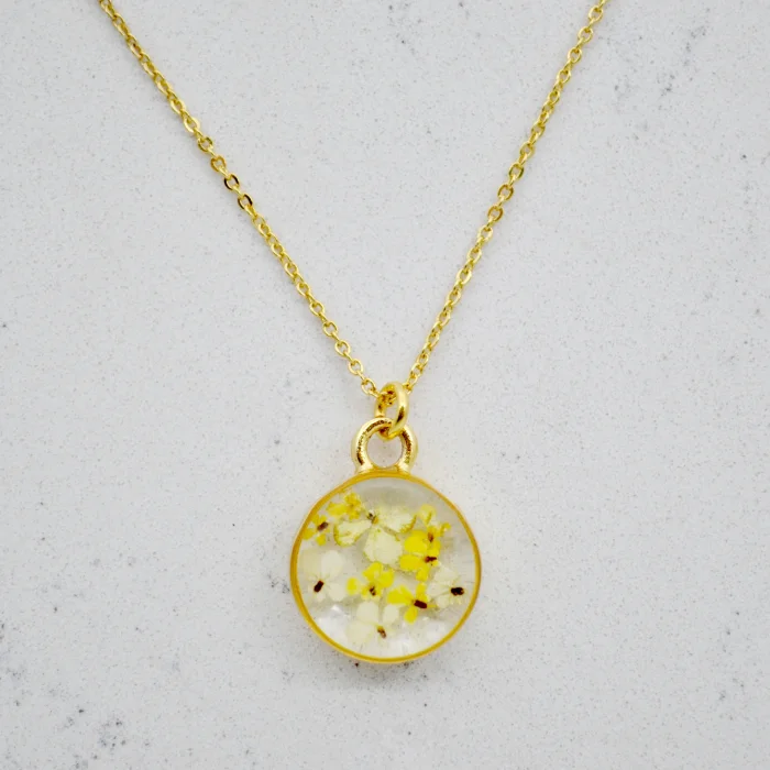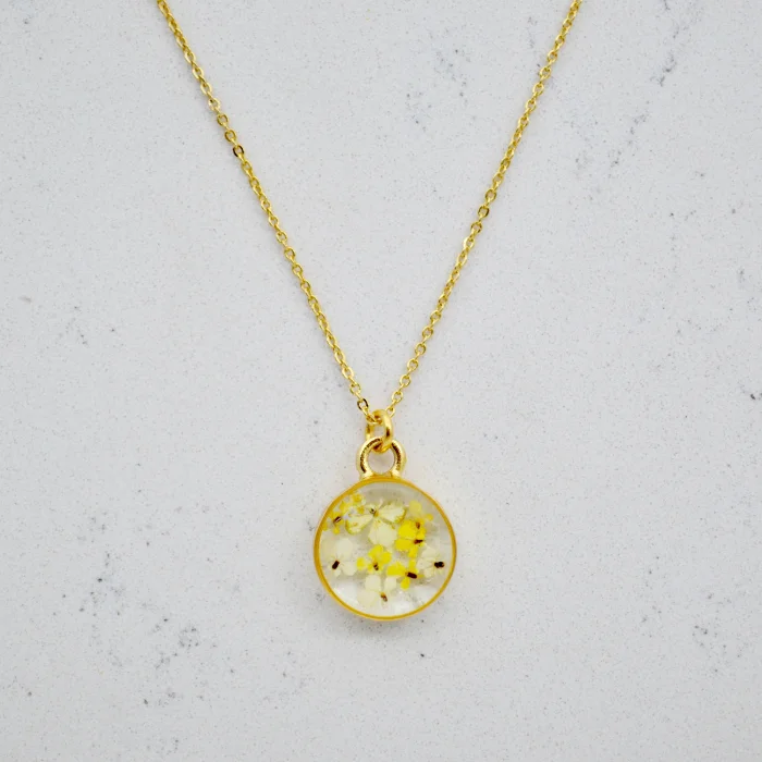 Each piece is filled with particles of Queen Anne's Lace flower, which are collected one by one by hand and then carefully plucked from the stem and pressed and dried.After the drying stage, these particles are carefully placed in handmade gold-plated frames and brought together with jewelry-grade crystal resin.