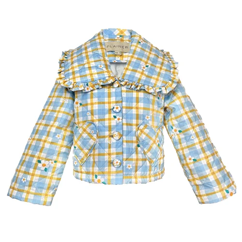 The Daisy Field Puff Jacket is handmade with tiny daisy print puff fabric sprinkled in plaid fabric. Run through the countryside in an oversized silhouette jacket with sweet heart pockets.