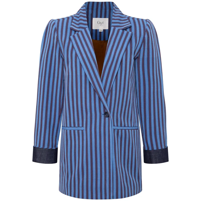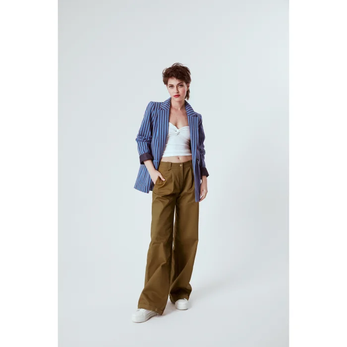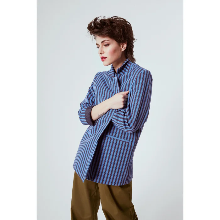 GİYİ BLAZER INDIGO STRIPES, tailored in handwoven cotton is a timeless, utilitarian and comfortable piece. Its magic comes from its handwoven fabric from Tokat, Anatolia. Cuffs can be turned up or worn down. The model is 1.74 tall, 55 kilos and wears an S.