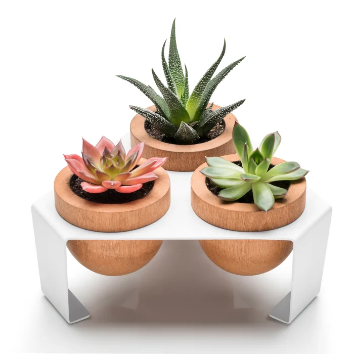 It's a hand made item crafted carefully emphasize the naturalness of wood and elegant surface of metal. Pots are made of Oak Wood which have a very smooth and beautiful surface with perfect curves. With it's stylish White Metal Stand, this succulent planter set is ideal for displaying on tables, shelves and windowsills.