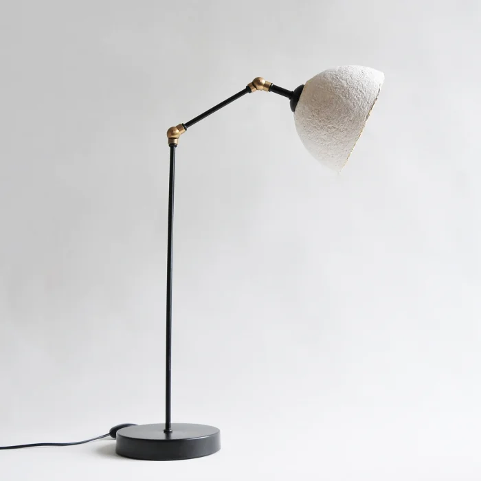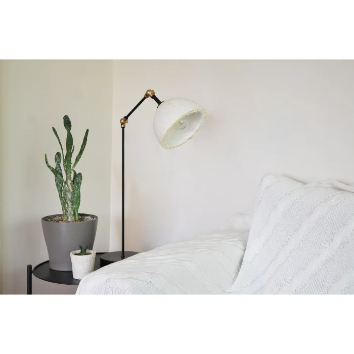 Biodegradable, mycelium table lamp. With its brass details and metal body, it promises a soft light and an organic reading to the living spaces.
