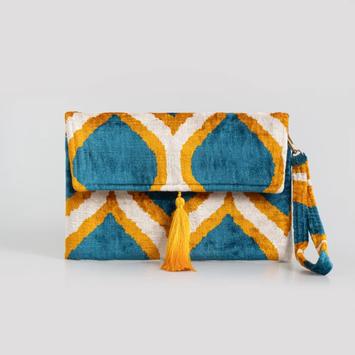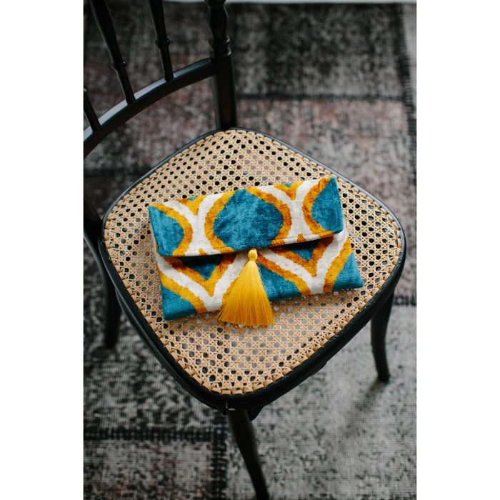• Hand-woven silk velvet ikat bag made in Istanbul.