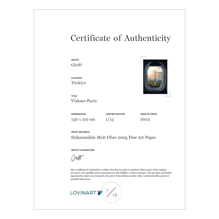 LIMITED EDITION ART PRINTS An edition artwork is defined as a copied or verbatim reproduction of an original work. While producing in limited editions, the number of editions of the work to be produced is determined in advance under the supervision of the artist who owns the work, and the work is not produced more than this number. CERTIFICATE OF AUTHENTICITY A limited edition artwork is sent to the art buyer with the artist's signature and the 'Certificate of Authenticity' indicated on which copy of which edition it is. In addition, all printing features, including the technique and quality with which it is produced, and the fine art paper used, are included on the certificate. MUSEUM-QUALITY PRINTS AND MODERN FRAMING OPTIONS Museum-quality archival pigment prints that we produce using Giclée (spraying) technique on only 200 grams of Hahnemühle fine art paper with world-class printing machines; They are fine art prints that have a lifespan of more than 100 years under normal room conditions. Acid-free and 100% cotton-based, Hahnemühle fine art papers, which give excellent results in terms of closeness to the original work in details and colors, are also guaranteed against fading. You can only order fine art prints of your works in rolls, and you can even choose the one that suits your taste from our modern frame alternatives and receive them ready to be hung. We make the framing process, which we carry out completely handcrafted and meticulously, with long-lasting, quality materials.