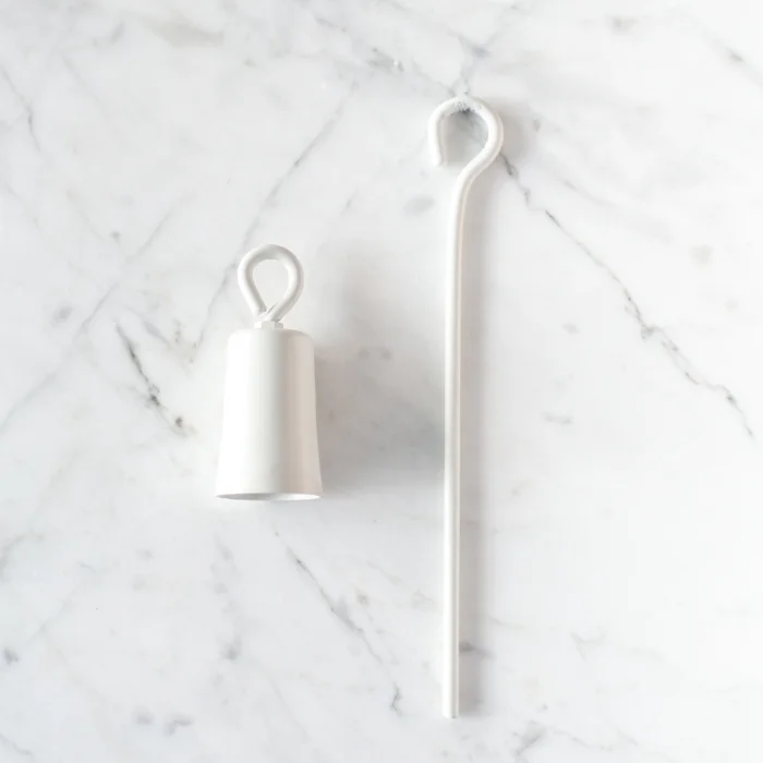 The conical shaped part of the metal candle snuffer is 7 cm high. The lower diameter of the conical part is 4 cm. You can use the conical piece alone as a candle snuffer. It is especially ideal for our stick candles. The hook-ended rod, which can be separated from the body, is 17 cm long. You can straighten the wicks of candlestick and jar candles with the hook-shaped stick, and you can extinguish the burning jar candle wicks by dipping them into the candle's own oil. There will be no smoke when extinguishing in this way. You can also use the hook-shaped stick to mix your herbal incense.
