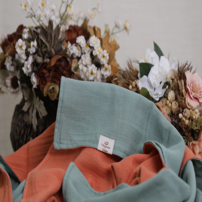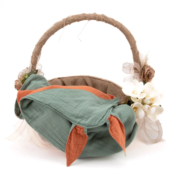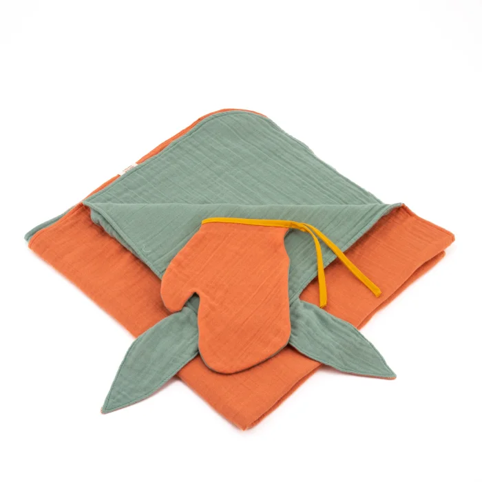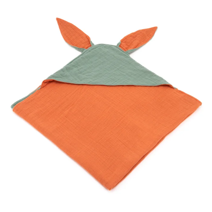 Our bunny ears hooded soft terry-blanket is muslin inside and out. If you haven't experienced muslin before, now is the time. This hooded towel protects your baby's head and ears. This towel keeps your little one warm and dry, making bath time a delightful adventure. This cute children's towel will dry your child quickly and keep you warm. It can also be used on the beach. This towel offers endless comfort and functionality as a blanket, nursing cover, playground blanket, play mat, blanket, and stroller cover. Fabric: Inner and Outer : 100% organic cotton muslin Available Sizes: Length- Width: 75 x 75 cm Ear: 16 cm