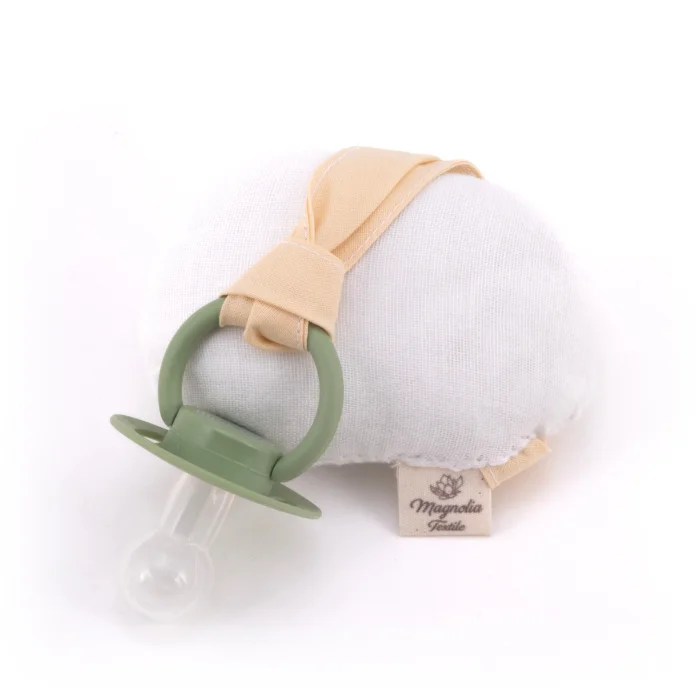 The teether/pacifier holder, which we produce from super soft, organic, handmade 2-ply muslin fabric, is in the shape of a cute egg. Your baby can hold the egg-shaped toothpiece with his hand, stimulating his senses and supporting the development of his motor skills. It can be a baby's first toy.
