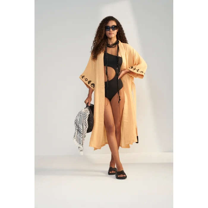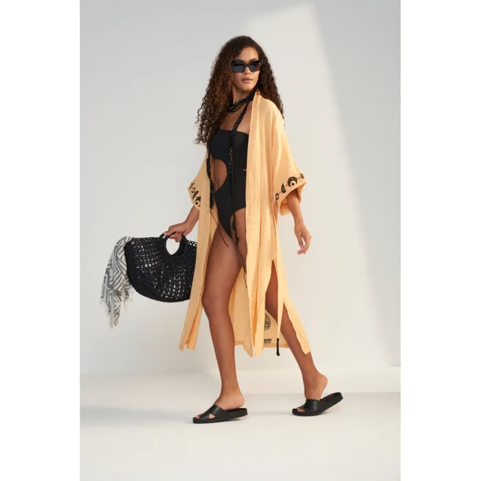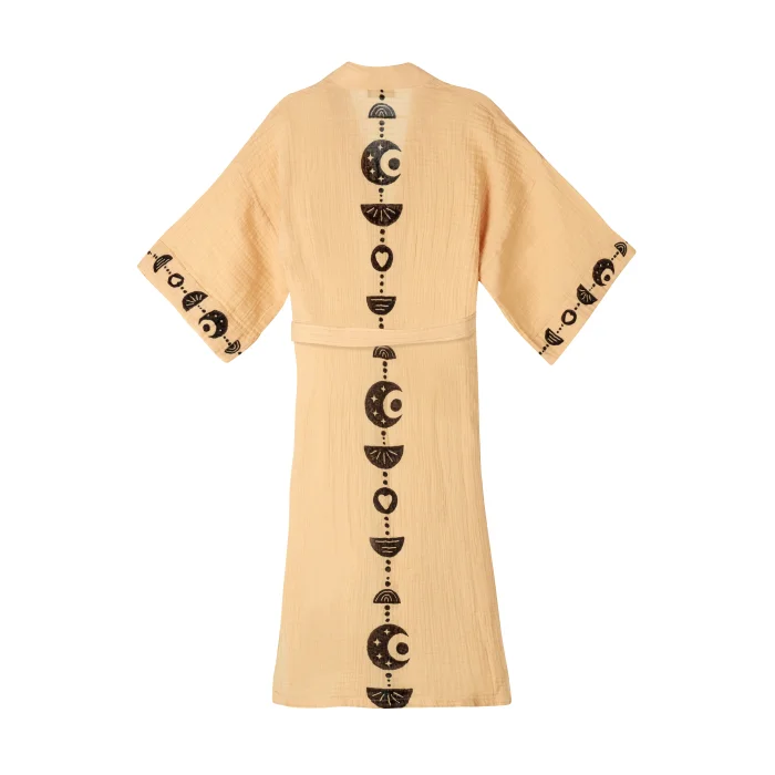 Comfortable cut, belted, 100% handcrafted stone print, 100% cotton, double layer muslin, made in Turkey. Shoulder 66 cm., arm 30 cm., height 125 cm.