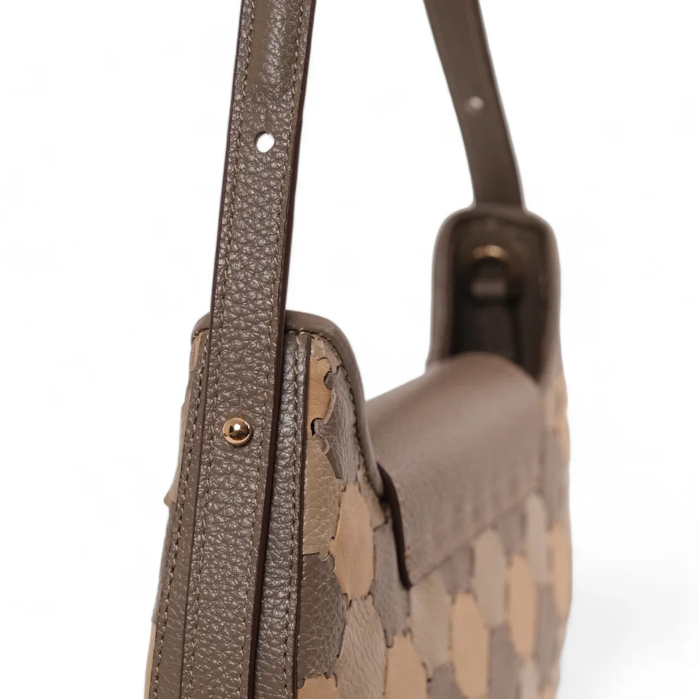 It provides versatility and convenience with its detachable and adjustable sized cross strap feature. You can keep your belongings organized with the inner zippered pocket and phone case. The interior is lined with recycled polyester. Width: 28 cm Height: 22 cm Depth: 6 cm Shoulder strap distance: 18 cm Cross strap size adjustable.