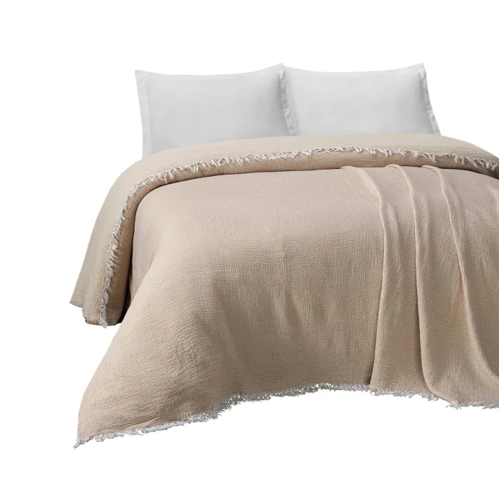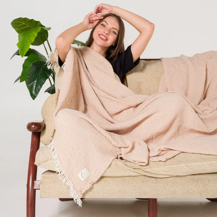 Our 3-layer double-sided breathable crepe muslin, produced from organic 100% Turkish cotton, is used for 4 seasons as a bed shawl, sofa shawl, TV blanket, pique with its soft texture produced with a very special weaving technique.