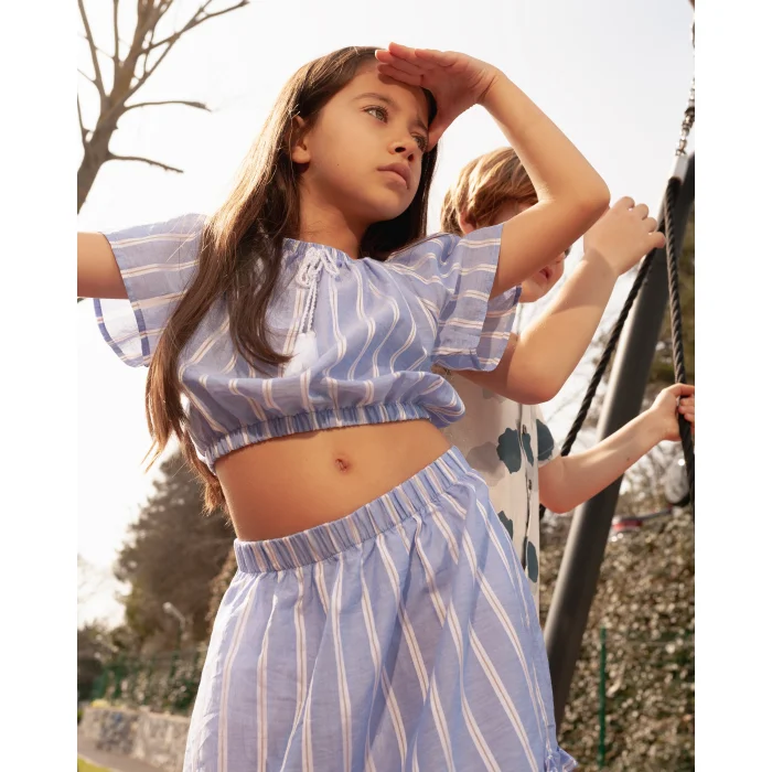 A unique style and comfort for your little princess! This light blue and white striped girls' blouse will add a touch of cool to her wardrobe.