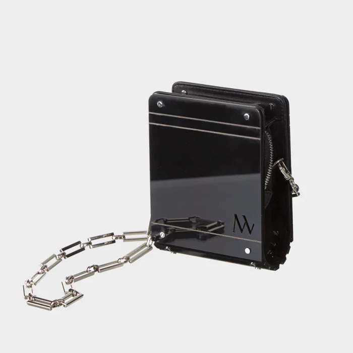 ‘Leo’ bag is covered with a shiny black plexy on calf leather and black suede leather on the side. Featured with zip fastening, laser cut logo and a detachable shoulder strap with a rectangle shaped chain.