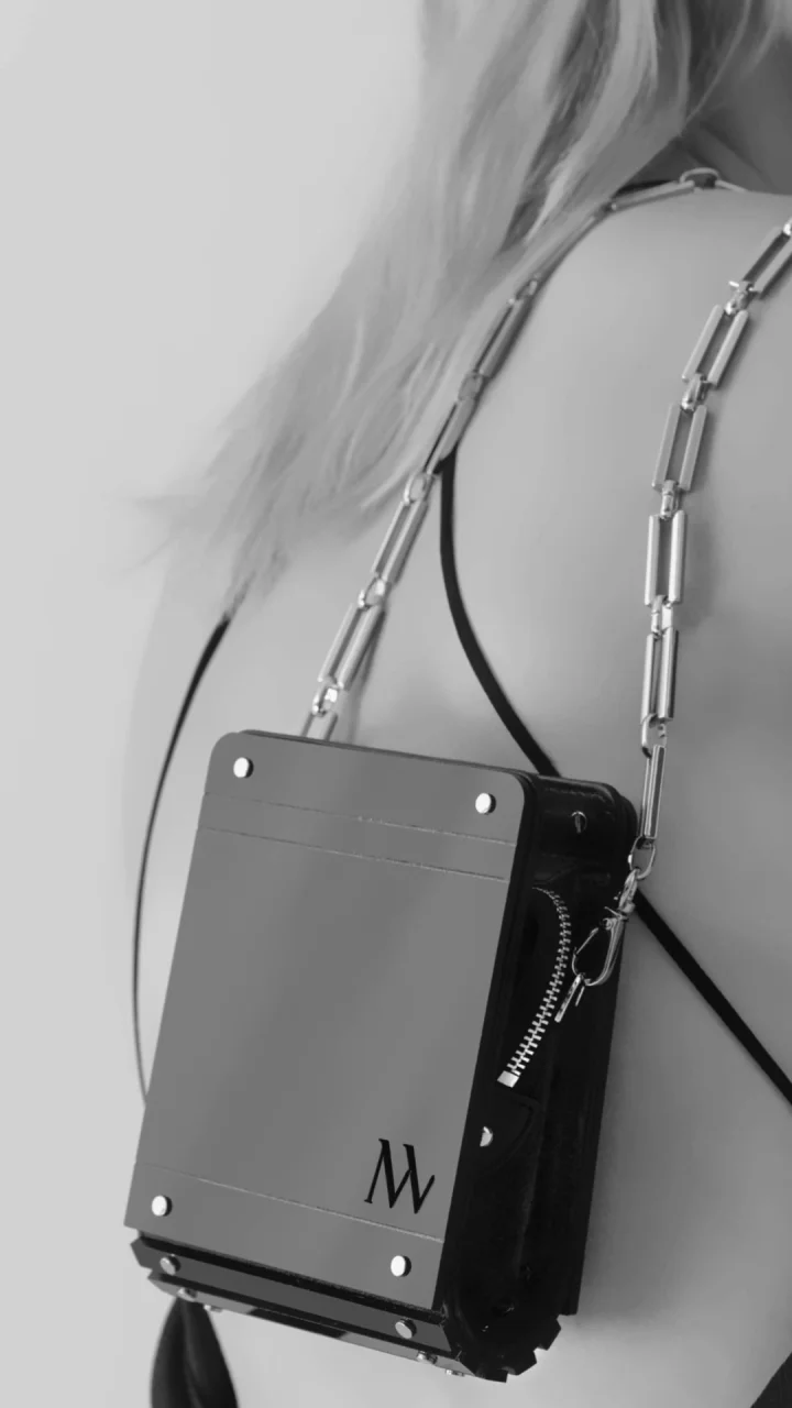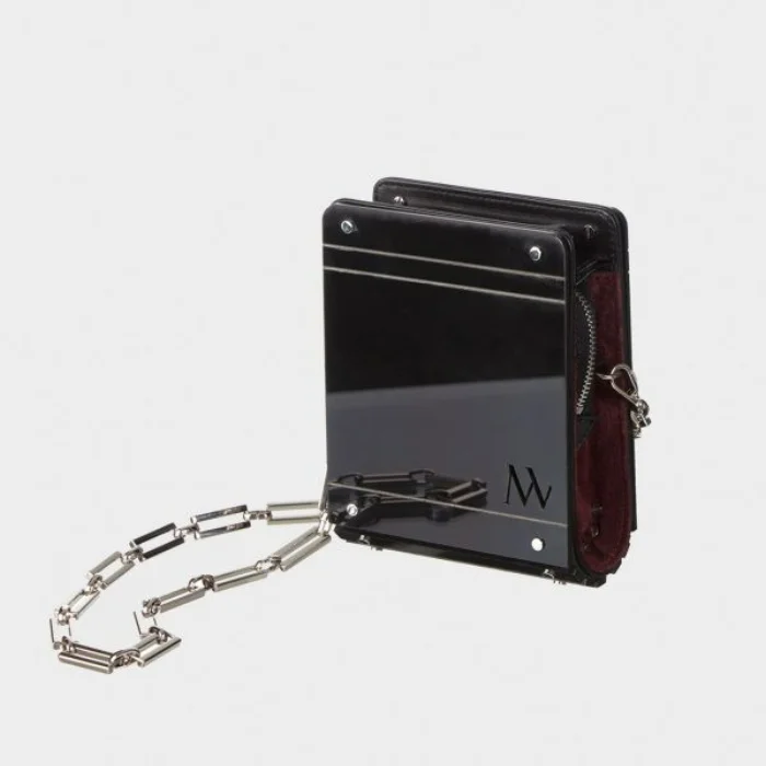 ‘Leo’ bag is covered with a shiny black plexy on calf leather and black suede leather on the side. Featured with zip fastening, laser cut logo and a detachable shoulder strap with a rectangle shaped chain.
