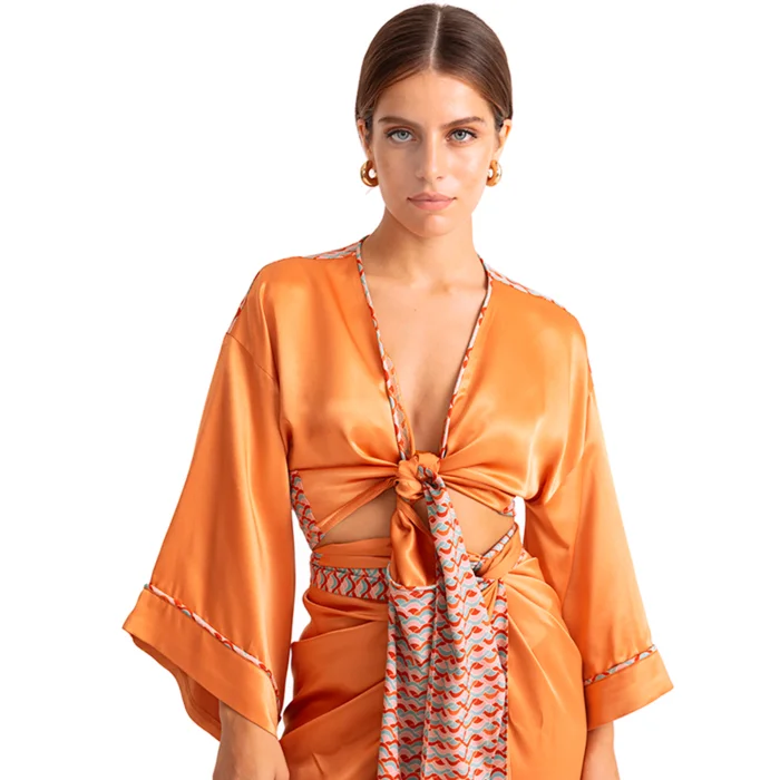 •Tie front style crop top. •Featuring wide sleeves. •Can be worn as envelope style by wrapping around on waist. •Soft silky vegan fabric.