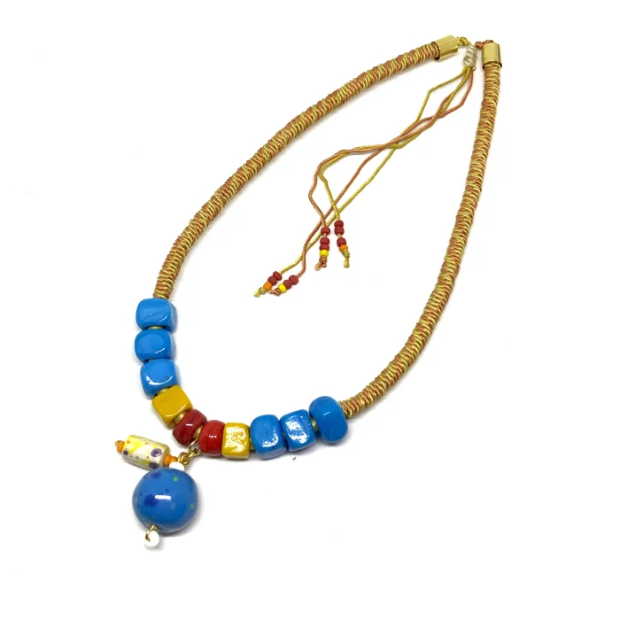 Dyed with immortal flower and madder root. It is produced with silk threads dyed with natural dyes, cotton ropes, handmade glass and ceramic beads and gold-plated brass accessories. It is standard size with adjustable threads.