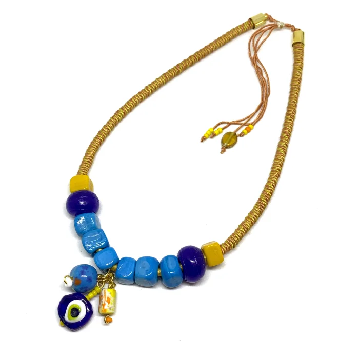 Dyed with immortal flower and madder root. It is produced with silk threads dyed with natural dyes, cotton ropes, handmade glass and ceramic beads and gold-plated brass accessories. It is standard size with adjustable threads.