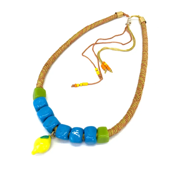 Dyed with immortal flower and madder root. It is produced with silk threads dyed with natural dyes, cotton ropes, handmade glass and ceramic beads and gold-plated brass accessories. It is standard size with adjustable threads.