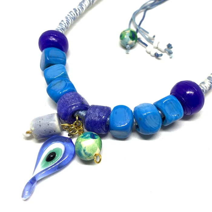 Dyed with indigo . It is produced with silk threads dyed with natural dyes, cotton ropes, handmade glass and ceramic beads and gold-plated brass accessories. It is standard size with adjustable threads.