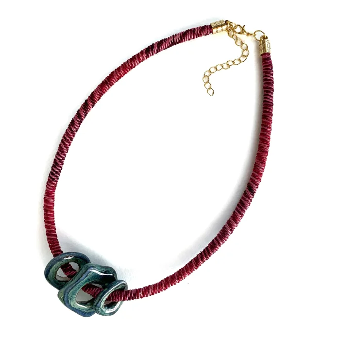 Produced with natural dyed silk threads, cotton ropes, ceramic beads and gold plated brass accesories.