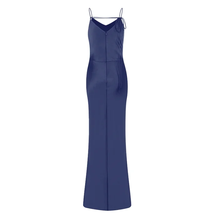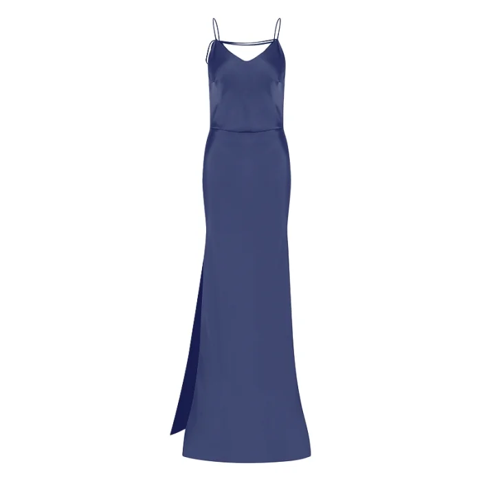 Satin Strap, Back Tie, Slit Long Evening Dress