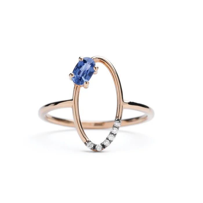 The contains 14k Rose Gold , 0.04 F Color SI Clarity and 0.39ct Shappire.