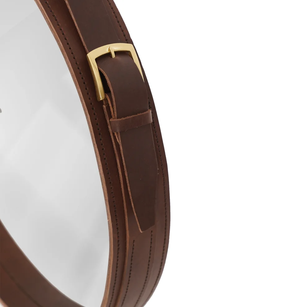 It is handmade by a single craftsman from top quality vegetable tanned leather, 3.5-4 mm thick. Hand stitched. The buckles and hanging apparatus are solid brass.