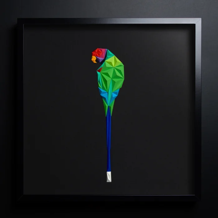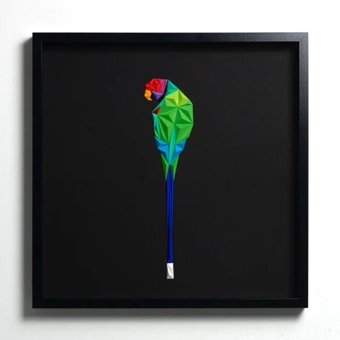The design is fixed on a paper-covered MDF surface. It is shipped with wooden frame and Plexiglass.