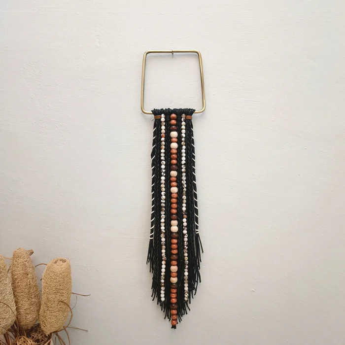 Karia is designed with aged metals, waxed cotton threads and beads left over from our bag productions. You can combine it with pleasure in entrances, living rooms, verandas and balconies. Each product is handmade, so sizes and colors may vary slightly.